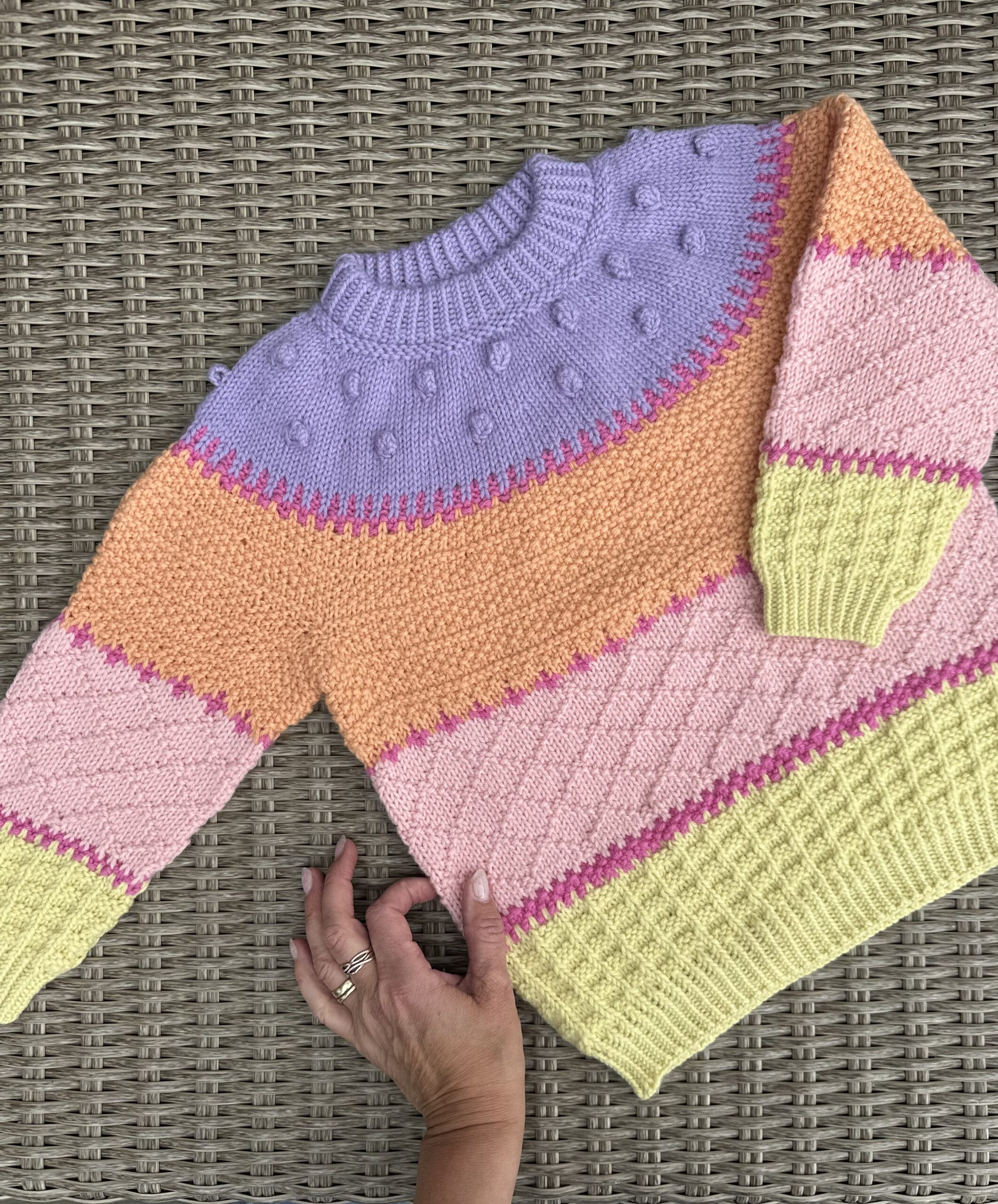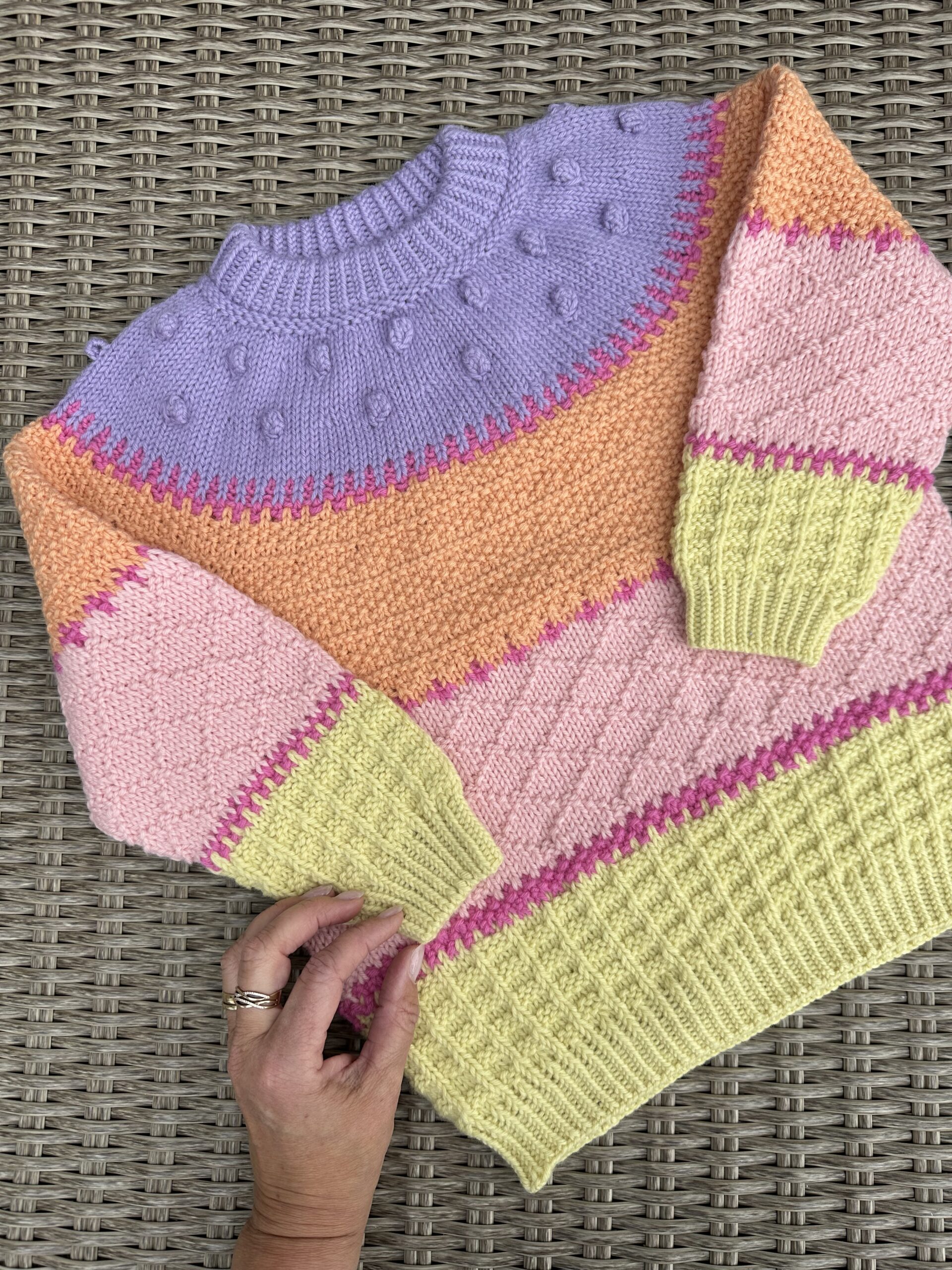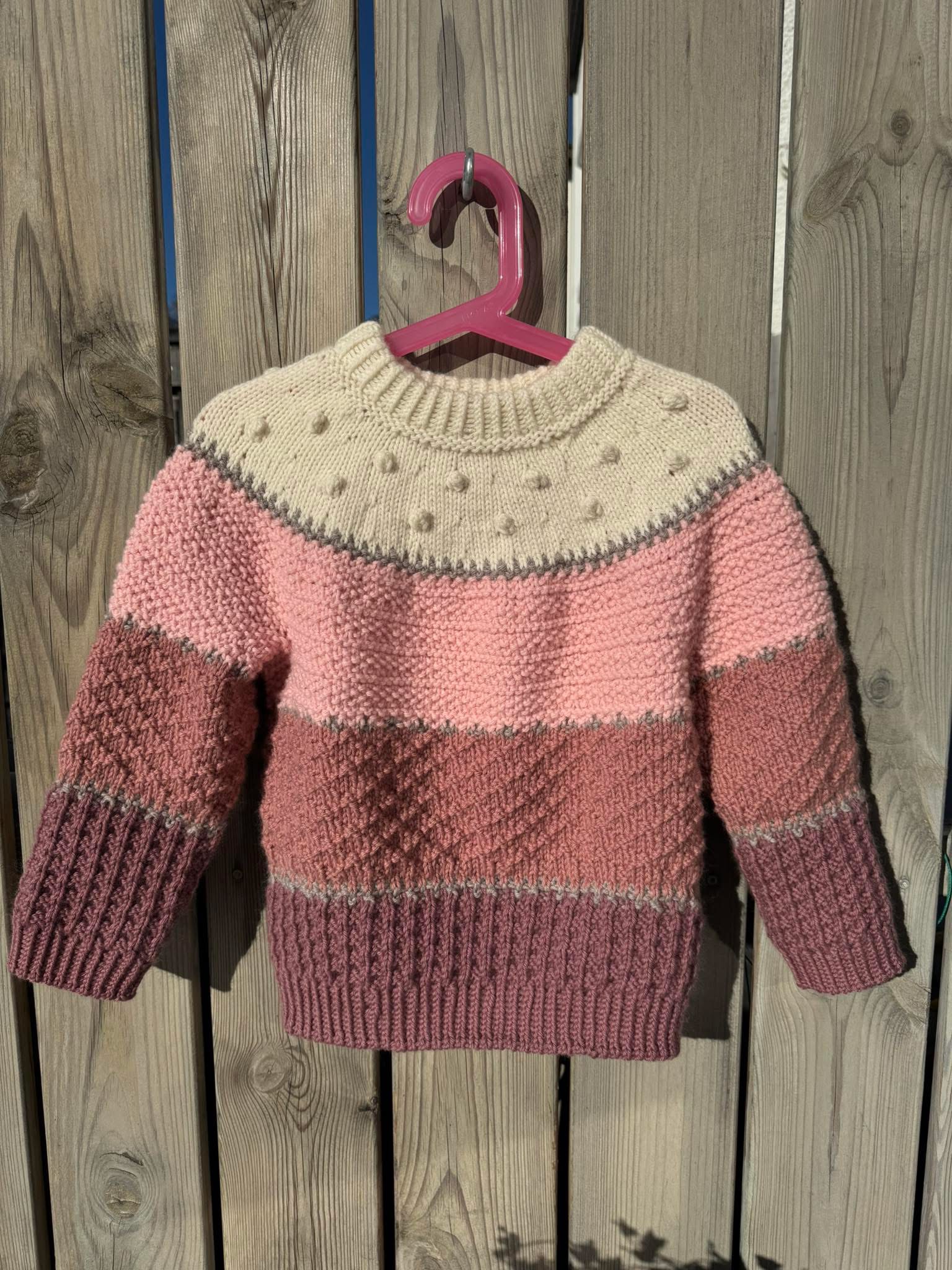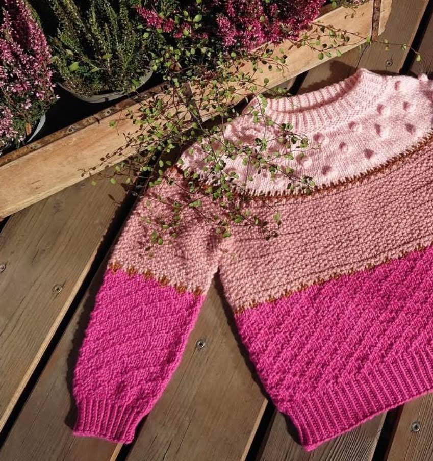 Litrík og sæt krakkapeysa með skemmtilegum munsturbekkjum.