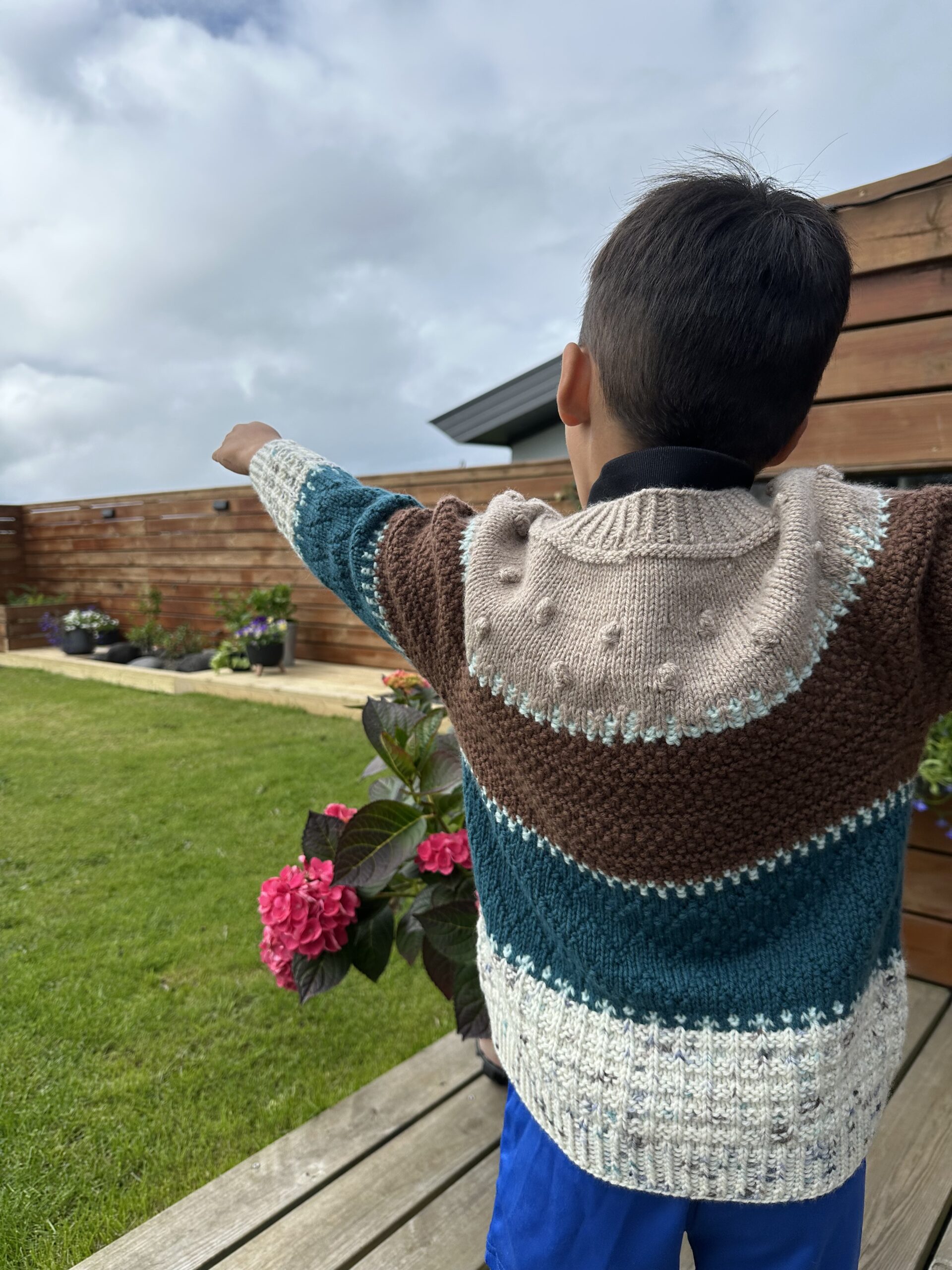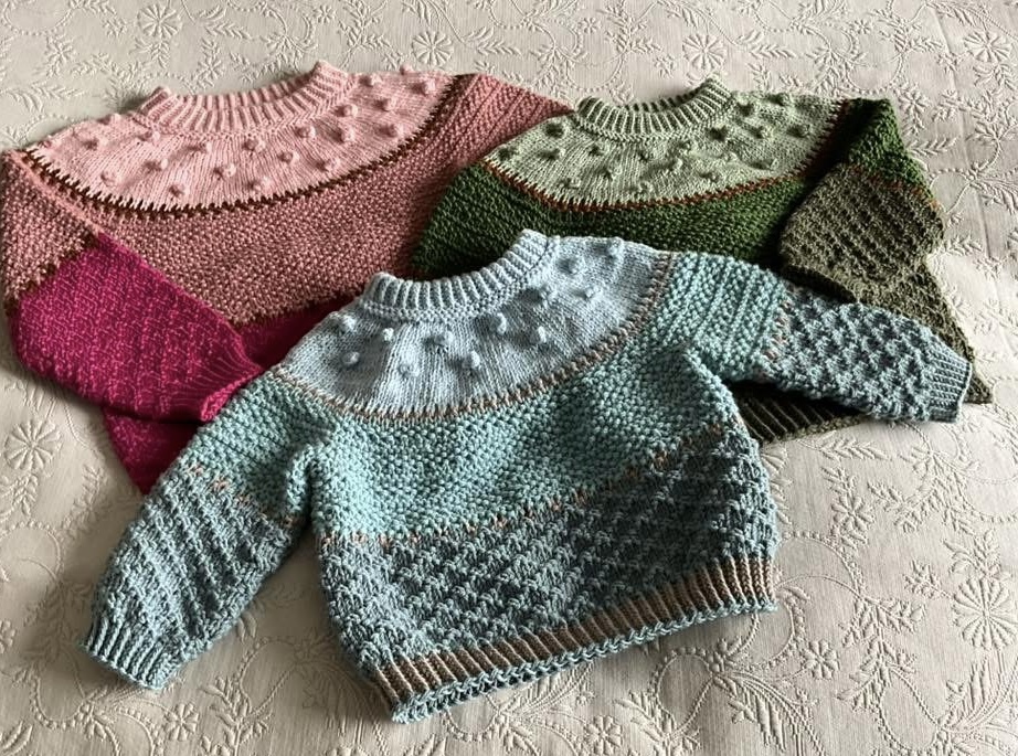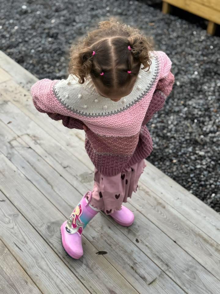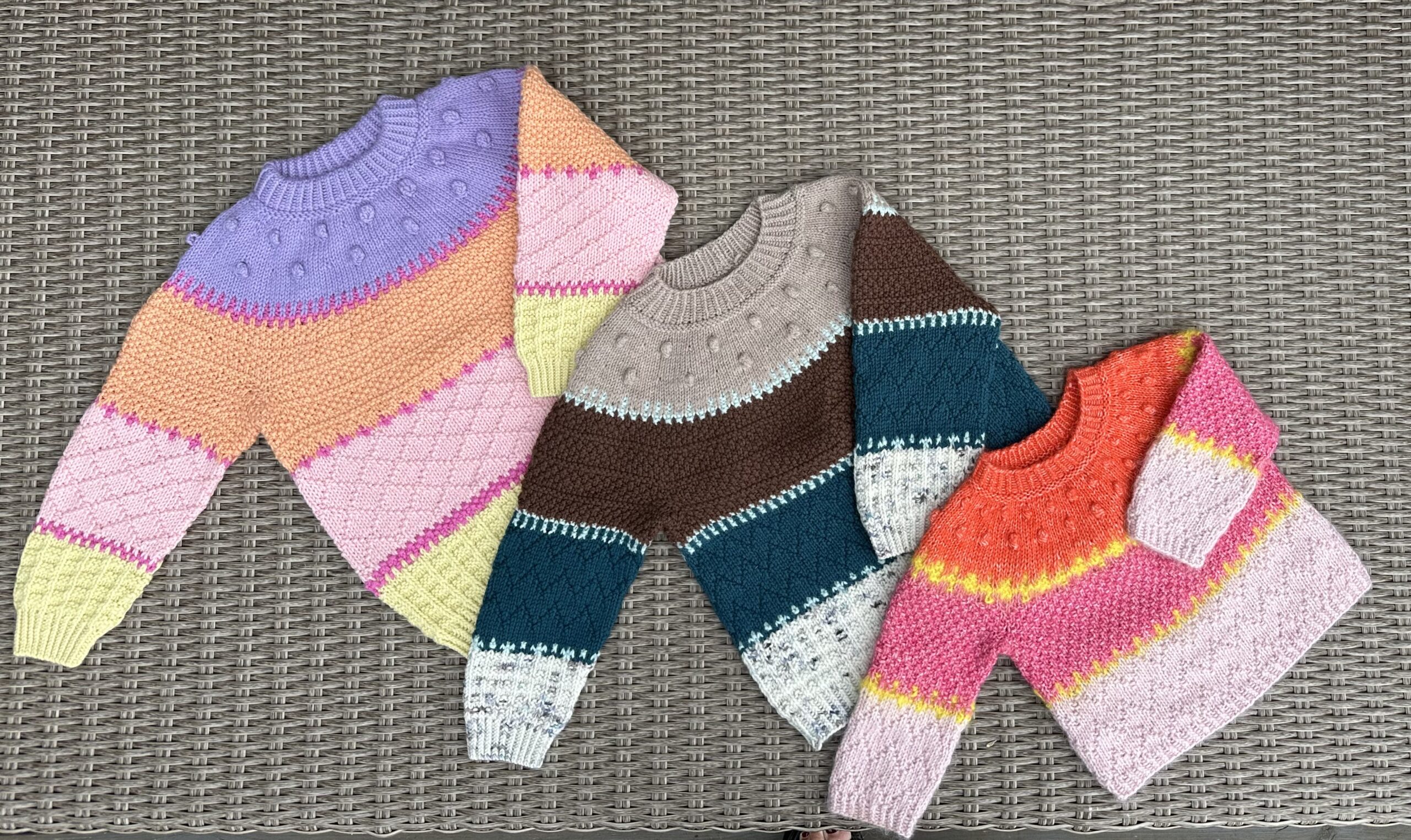 Litrík og sæt krakkapeysa með skemmtilegum munsturbekkjum.